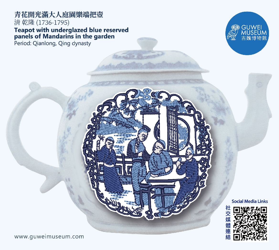 Teapot with underglaze blue reserved panels of Mandarins in the garden